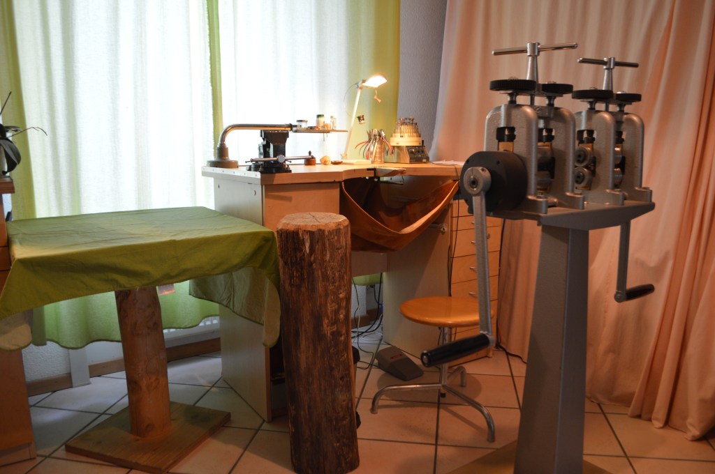 Atelier de bijouterie avec établi, outillage, laminoir