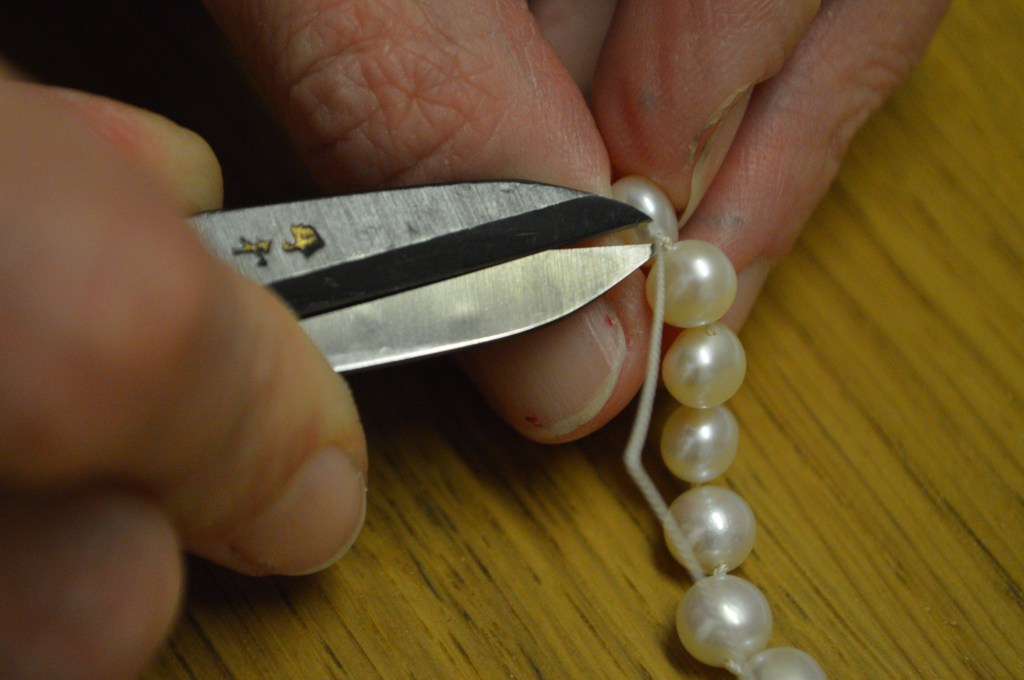 Finition sur le collier en coupant le fil de soie